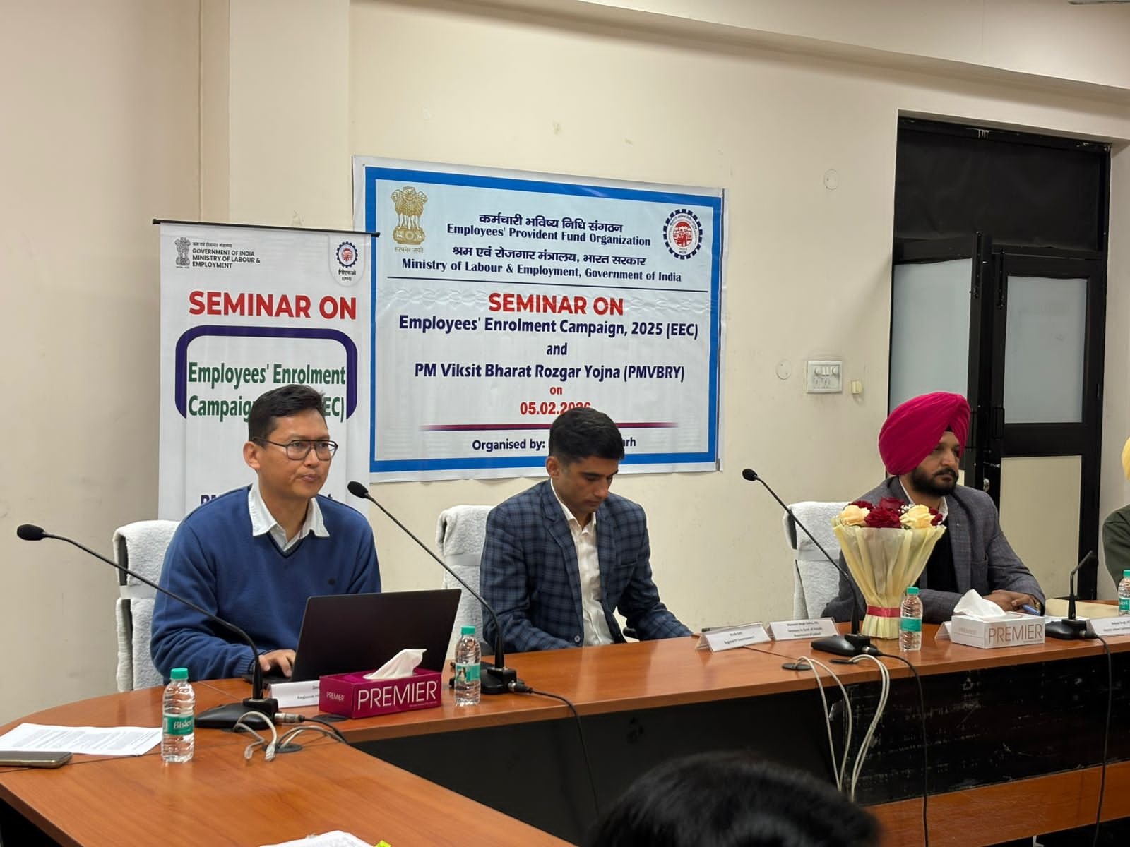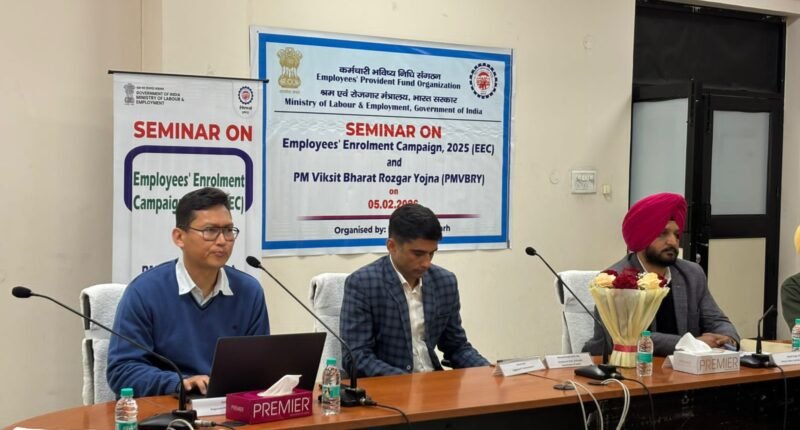 कर्मचारियों को सामाजिक सुरक्षा के दायरे में लाने के उद्देश्य से कर्मचारी भविष्य निधि संगठन (ईपीएफओ)द्वारा कर्मचारियों का नामांकन अभियान (EEC-2025), प्रधानमंत्री विकसित भारत रोजगार योजना (PM-VBRY) और सामाजिक सुरक्षा संहिता (CoSS) नियम 2020 को लेकर एक दिवसीय सेमिनार का आयोजन किया गया। यह सेमिनार पंजाब सरकार के श्रम विभाग के सहयोग से लेबर भवन, फेज-10, मोहाली में आयोजित हुआ।यह सेमिनार भारत सरकार के श्रम सचिव के निर्देशों के तहत आयोजित किया गया, जिसका उद्देश्य राज्य सरकार के विभागों और कार्यालयों के माध्यम से ठेका एवं आउटसोर्स कर्मचारियों तक ईपीएफओ की योजनाओं की जानकारी पहुंचाना है, ताकि उन्हें सामाजिक सुरक्षा कवरेज प्रदान किया जा सके।सेमिनार में पंजाब सरकार के विभिन्न विभागों के अधिकारियों ने भाग लिया। ईपीएफओ की ओर से श्री ऋतेश सैनी, क्षेत्रीय पीएफ आयुक्त-I तथा श्री दीपक पाल, क्षेत्रीय पीएफ आयुक्त-II, चंडीगढ़ सहित अन्य अधिकारी उपस्थित रहे। वहीं, पंजाब सरकार के श्रम विभाग का प्रतिनिधित्व श्री बलजीत सिंह, उप श्रम आयुक्त ने किया। कुल 62 अधिकारी इस कार्यक्रम में शामिल हुए।कार्यक्रम के दौरान श्री दीपक पाल ने कर्मचारियों के नामांकन अभियान (EEC-2025) पर विस्तृत प्रस्तुति दी। उन्होंने बताया कि यह अभियान पहले से वंचित पात्र कर्मचारियों, विशेषकर ठेका और आउटसोर्स श्रमिकों को ईपीएफ के दायरे में लाने के लिए शुरू किया गया है। अभियान के तहत स्वैच्छिक अनुपालन, सरल पंजीकरण प्रक्रिया और क्षतिपूर्ति में छूट जैसे लाभ प्रदान किए जा रहे हैं।इसके अलावा प्रतिभागियों को प्रधानमंत्री विकसित भारत रोजगार योजना (PM-VBRY) की प्रमुख विशेषताओं से भी अवगत कराया गया। साथ ही सामाजिक सुरक्षा संहिता (CoSS) नियम 2020 के प्रावधानों की जानकारी देते हुए नियोक्ताओं की जिम्मेदारियों पर विशेष जोर दिया गया, ताकि सभी पात्र कर्मचारियों को सामाजिक सुरक्षा लाभ सुनिश्चित किए जा सकें।सेमिनार के अंत में एक संवादात्मक सत्र आयोजित किया गया, जिसमें प्रतिभागियों ने ठेका कर्मचारियों की कवरेज, अनुपालन प्रक्रिया और सामाजिक सुरक्षा प्रावधानों के क्रियान्वयन से जुड़े सवाल पूछे। कार्यक्रम का समापन धन्यवाद ज्ञापन के साथ हुआ।