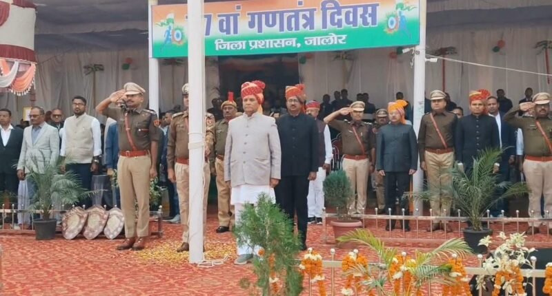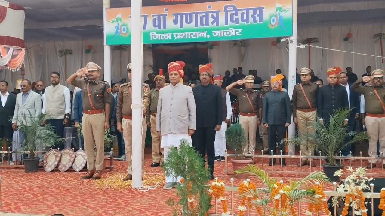 मुख्य अतिथि श्री जोगेश्वर गर्ग ने अपने संबोधन में कहा कि गणतंत्र दिवस हमें संविधान द्वारा प्रदत्त अधिकारों और कर्तव्यों की याद दिलाता है। उन्होंने कहा कि लोकतंत्र की मजबूती के लिए नागरिकों का जागरूक और जिम्मेदार होना आवश्यक है। उन्होंने युवाओं से राष्ट्र निर्माण में सक्रिय भूमिका निभाने का आह्वान किया।जिला प्रशासन की ओर से उत्कृष्ट कार्य करने वाले कर्मचारियों और विभिन्न क्षेत्रों में उल्लेखनीय उपलब्धि हासिल करने वाले प्रतिभागियों को सम्मानित भी किया गया। समारोह शांतिपूर्ण, अनुशासित और उल्लासपूर्ण वातावरण में संपन्न हुआ।पूरे कार्यक्रम स्थल को तिरंगे की थीम और देशभक्ति प्रतीकों से आकर्षक ढंग से सजाया गया था, जिसने गणतंत्र दिवस समारोह को यादगार बना दिया। जालोर (राजस्थान) में आयोजित यह आयोजन राष्ट्रीय एकता, अखंडता और संविधान के प्रति आस्था का सशक्त प्रतीक बनकर सामने आया।