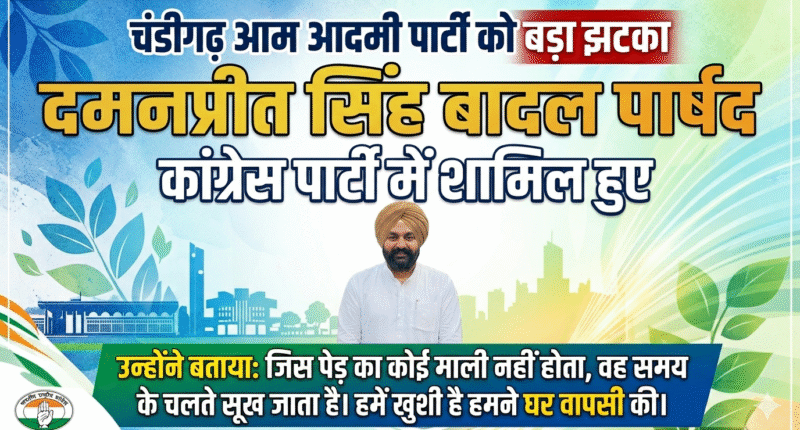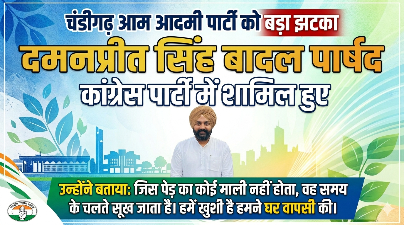 चंडीगढ़ 22 मार्च 2026( दैनिक खबरनामा ) चंडीगढ़ में कांग्रेस पार्टी को आज बड़ी राजनीतिक बढ़त मिली, जब वार्ड नंबर-17 (सेक्टर 22 और 23) से आम आदमी पार्टी के पार्षद दमनप्रीत सिंह बादल ने अपने सैकड़ों समर्थकों के साथ कांग्रेस का दामन थाम लिया। सेक्टर-35 स्थित राजीव गांधी कांग्रेस भवन में आयोजित कार्यक्रम के दौरान उन्होंने चंडीगढ़ प्रदेश कांग्रेस कमेटी के अध्यक्ष हरमोहिंदर सिंह लक्की की मौजूदगी में पार्टी जॉइन की।इस मौके पर आम आदमी पार्टी के पूर्व प्रदेश महासचिव और डिस्ट्रिक्ट बार एसोसिएशन सेक्टर-43 के कोषाध्यक्ष उज्जवल भसीन, वकील विशाल शर्मा और युवराज अष्ट ने भी कांग्रेस में शामिल होकर संगठन को मजबूती दी।प्रदेश कांग्रेस अध्यक्ष एच.एस. लक्की ने नए साथियों का स्वागत करते हुए कहा कि जमीनी स्तर पर मजबूत पकड़ रखने वाले नेताओं के जुड़ने से पार्टी को नई ऊर्जा मिलेगी। उन्होंने भरोसा जताया कि आने वाले समय में अन्य दलों के नेता भी कांग्रेस की विचारधारा और राहुल गांधी के नेतृत्व से प्रभावित होकर पार्टी में शामिल होंगे।दमनप्रीत सिंह बादल ने इसे “घर वापसी” करार देते हुए कहा कि अब उन्हें विश्वास है कि कांग्रेस के मंच से वे अपने क्षेत्र और शहर की बेहतर सेवा कर सकते हैं।वहीं उज्जवल भसीन ने कहा कि अधिवक्ताओं के बीच कांग्रेस की मजबूत पकड़ से प्रभावित होकर उन्होंने यह फैसला लिया।कार्यक्रम में मौजूद नेताओं ने कहा कि नए चेहरों के जुड़ने से कांग्रेस और अधिक सशक्त होगी तथा भविष्य में और नेता भी पार्टी में शामिल हो सकते हैं।