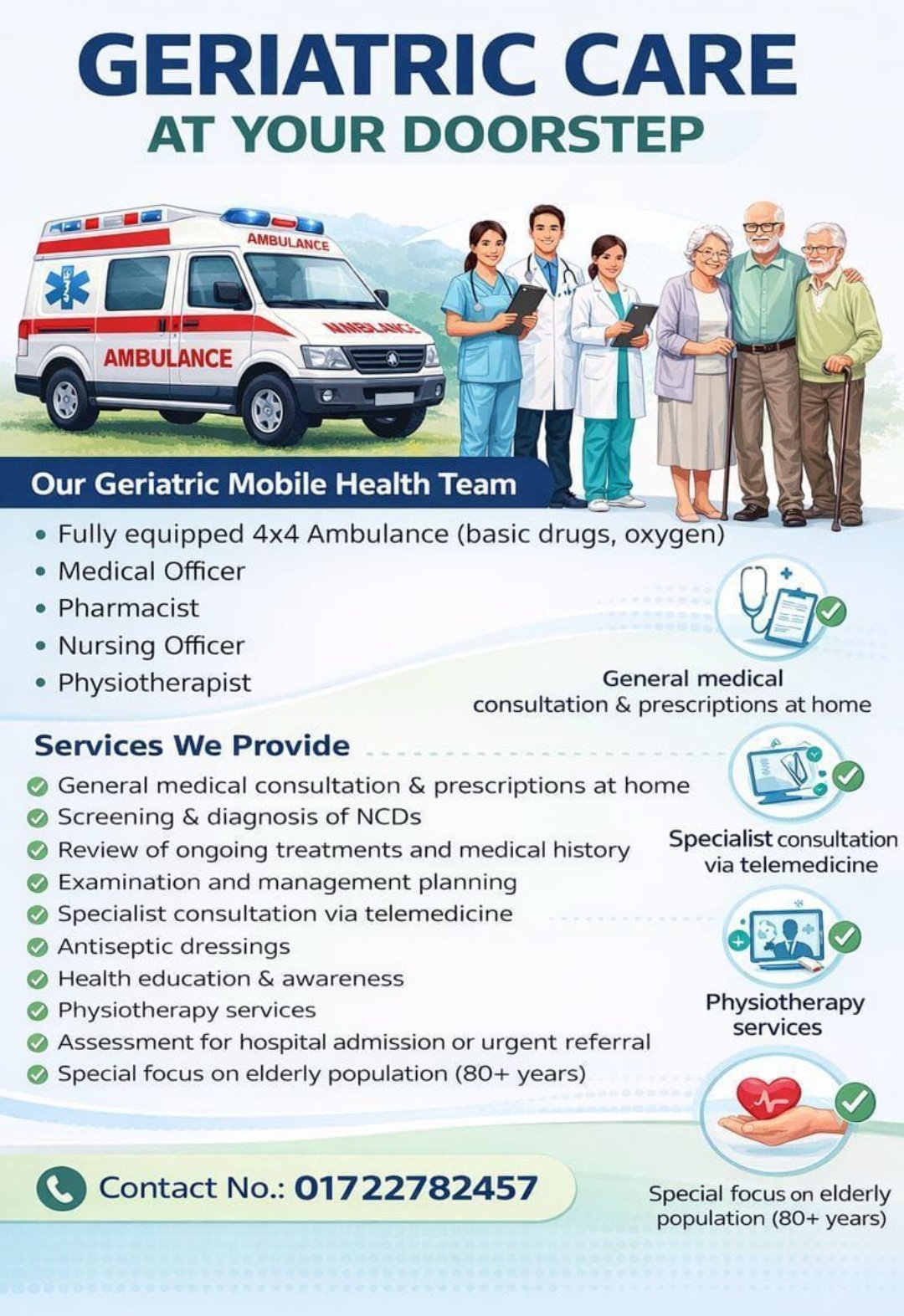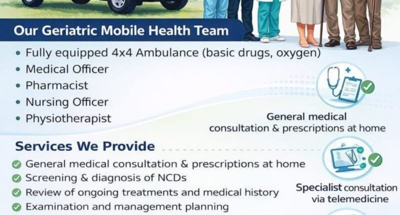 मोबाइल हेल्थ यूनिट के साथ मेडिकल ऑफिसर, नर्सिंग स्टाफ, फार्मासिस्ट और फिजियोथेरेपिस्ट की टीम तैनात रहेगी, जो मरीज के घर जाकर जांच करेगी और आवश्यक उपचार व सलाह देगी। जरूरत पड़ने पर विशेषज्ञ डॉक्टरों से ऑनलाइन परामर्श भी करवाया जाएगा।अस्पताल प्रशासन के अनुसार, जनवरी तक इस योजना के तहत 98 बुजुर्गों को घर बैठे स्वास्थ्य सेवाओं का लाभ मिल चुका है और लोगों से सकारात्मक प्रतिक्रिया भी मिल रही है।