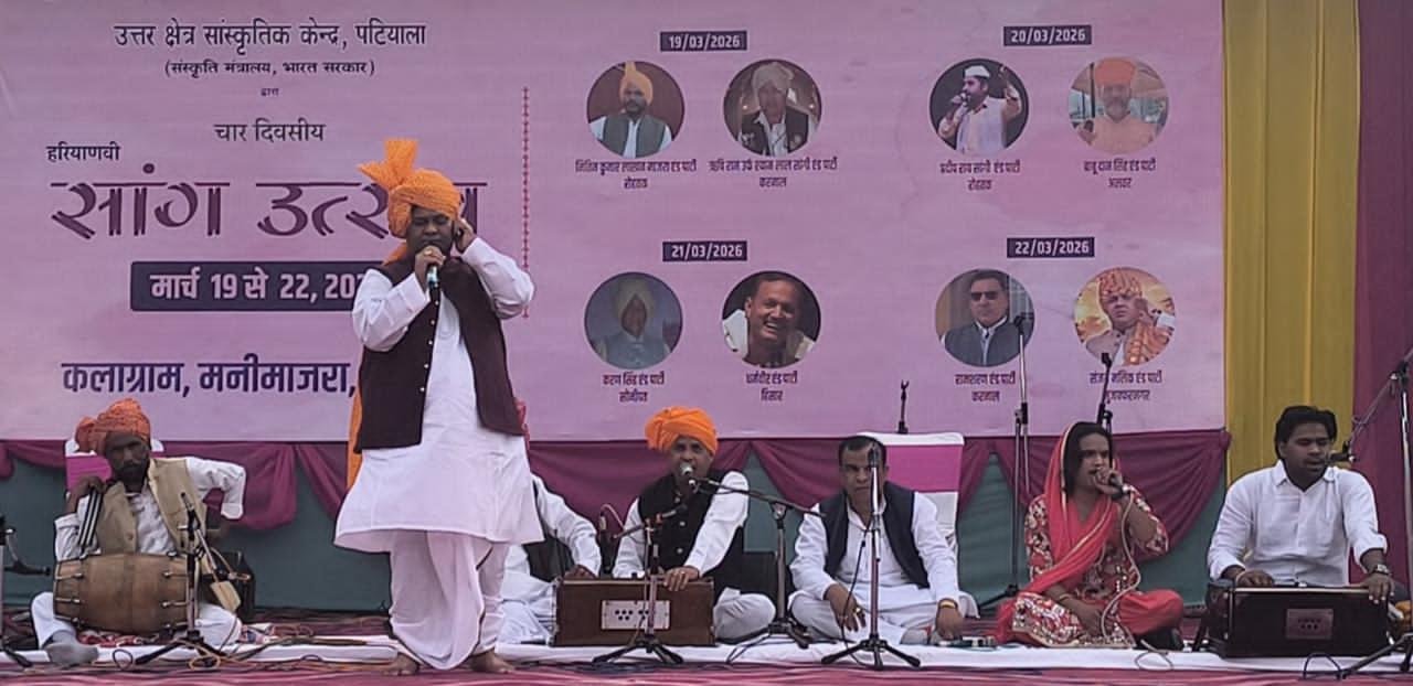 चंडीगढ़, 22 मार्च 2026(दैनिक खबरनामा) चंडीगढ़ चार दिवसीय हरियाणवी ‘सांग उत्सव-26’ का कलाग्राम में रविवार को भव्य समापन हुआ। नॉर्थ जोन कल्चरल सेंटर, संस्कृति मंत्रालय, भारत सरकार की पहल पर आयोजित इस उत्सव ने हरियाणा की समृद्ध लोक कला और सांस्कृतिक विरासत की शानदार झलक पेश की। खराब मौसम और बादलों के बीच भी बड़ी संख्या में लोग पारंपरिक लोक नाट्य का आनंद लेने पहुंचे।समापन दिवस पर प्रसिद्ध सांग कलाकार संजय मलिक और उनकी टीम ने मंच संभालते हुए अपनी प्रस्तुति “राजा वीर विक्रमजीत खंडेराव परी…” से दर्शकों को मंत्रमुग्ध कर दिया। उनकी रागिनी “केह के उल्टा…” और “पकड़ कलेजा रोण लागी…” ने श्रोताओं को भावुक कर दिया और पंडाल तालियों की गड़गड़ाहट से गूंज उठा।इसके बाद मुख्य कलाकार रामशरण और उनकी मंडली ने राजकुमार चंदरहास की कहानी को हरियाणवी शैली में प्रस्तुत किया। साथ ही भगवान श्रीकृष्ण और सुदामा की मित्रता पर आधारित रागिनी ने दर्शकों का दिल जीत लिया। भावनात्मक गहराई और मधुर गायन से सजी इस प्रस्तुति को खूब सराहा गया।