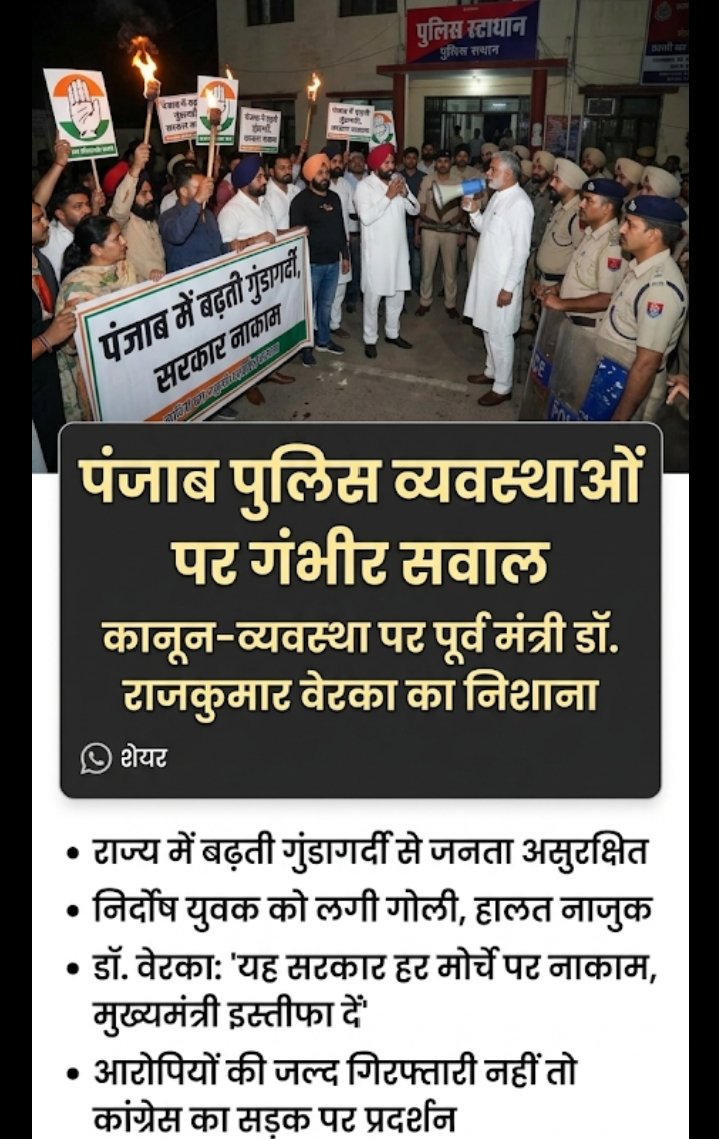 पंजाब 18 मार्च 2026 (दैनिक खबरनामा) पंजाब में कानून-व्यवस्था को लेकर एक बार फिर सवाल खड़े हो गए हैं। एक युवक को गोली लगने की घटना के बाद इलाके में हड़कंप मच गया। घायल युवक को गंभीर हालत में अस्पताल में भर्ती कराया गया है, जहां उसका इलाज जारी है।इस घटना को लेकर पूर्व कैबिनेट मंत्री डॉ. राजकुमार वेरका ने कड़ी प्रतिक्रिया दी है। उन्होंने कहा कि राज्य में गुंडागर्दी बढ़ रही है और आम लोग असुरक्षित महसूस कर रहे हैं। उन्होंने सरकार पर निशाना साधते हुए मुख्यमंत्री से इस्तीफे की मांग की और चेतावनी दी कि अगर आरोपियों की जल्द गिरफ्तारी नहीं हुई तो कांग्रेस सड़कों पर उतरकर प्रदर्शन करेगी।