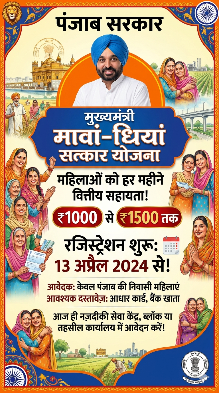 दैनिक खबरनामा 4 अप्रैल 2026 पंजाब सरकार ने ‘मुख्यमंत्री मावां-धियां सत्कार योजना’ का नोटिफिकेशन जारी कर दिया है। इस योजना के तहत 18 साल से ऊपर की महिलाओं को आर्थिक सहायता दी जाएगी। जनरल वर्ग की महिलाओं को ₹1000 और एससी वर्ग की महिलाओं को ₹1500 प्रति माह मिलेंगे। इस योजना की घोषणा 8 मार्च को राज्य बजट में की गई थी।योजना का लाभ लेने के लिए पंजाब का आधार कार्ड और वोटर आईडी होना अनिवार्य है। रजिस्ट्रेशन प्रक्रिया 13 अप्रैल से शुरू होगी, जो आंगनबाड़ी केंद्रों और सेवा केंद्रों पर पूरी तरह मुफ्त कराई जाएगी।
