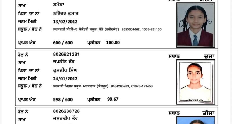 दैनिक ख़बरनामा 11 अप्रैल 2026 चंडीगढ़, 10 अप्रैल पंजाब स्कूल शिक्षा बोर्ड (PSEB) ने 8वीं कक्षा का परीक्षा परिणाम घोषित कर दिया है। इस बार फरीदकोट जिले के जैतो स्थित सरस्वती सीनियर सेकेंडरी स्कूल की छात्रा तमन्ना ने शानदार प्रदर्शन करते हुए 600 में से पूरे 600 अंक हासिल कर पूरे पंजाब में पहला स्थान प्राप्त किया है।वहीं, संगरूर के सरकारी मिडिल स्कूल अकवास की छात्रा जपनीत कौर और फरीदकोट के संत मोहन दास मेमोरियल सीनियर सेकेंडरी स्कूल, कोट सुखिया की छात्रा जशनदीप कौर ने 598 अंक (99.67%) हासिल कर क्रमशः दूसरा और तीसरा स्थान प्राप्त किया। खास बात यह है कि टॉप तीनों छात्राओं ने खेलों में भी राष्ट्रीय स्तर पर उपलब्धियां हासिल की हैं।इस साल कुल 2,62,966 विद्यार्थियों ने परीक्षा दी, जिनमें से 2,53,789 छात्र पास हुए। इस तरह कुल पास प्रतिशत 96.51% रहा।पंजाब के शिक्षा मंत्री हरजोत सिंह बैंस ने इस शानदार परिणाम पर छात्रों को बधाई देते हुए कहा कि यह सफलता मुख्यमंत्री भगवंत सिंह मान के नेतृत्व में राज्य सरकार द्वारा किए गए शिक्षा सुधारों का नतीजा है।
