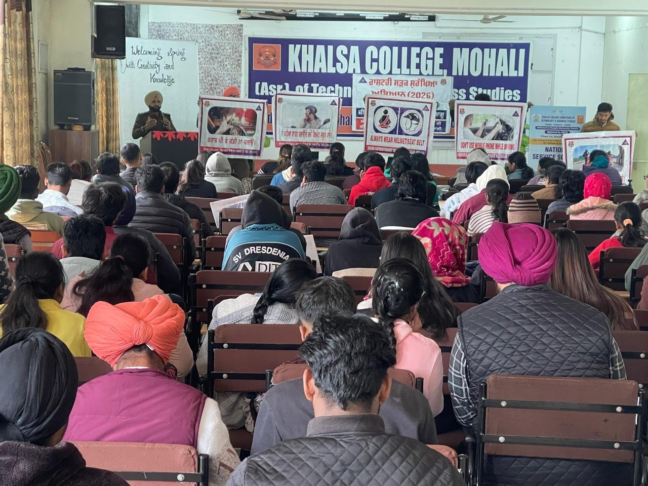 पंजाब 28 जनवरी 2026 (दैनिक खबरनामा) पंजाब में राष्ट्रीय सड़क सुरक्षा माह (1 जनवरी से 31 जनवरी 2026) के तहत एस.ए.एस. नगर जिले में ट्रैफिक पुलिस द्वारा लगातार जागरूकता कार्यक्रम आयोजित किए जा रहे हैं। इसी कड़ी में आज खालसा कॉलेज मोहाली (टेक्नोलॉजी एंड बिजनेस स्टडीज़), फेज़-3ए, मोहाली में रोड सेफ्टी जागरूकता सेमिनार का आयोजन किया गया।यह सेमिनार वरिष्ठ पुलिस अधीक्षक एस.ए.एस. नगर श्री हरमनदीप सिंह हंस, आईपीएस के दिशा-निर्देशों पर डीएसपी ट्रैफिक स. कर्नैल सिंह, पीपीएस द्वारा कॉलेज के अध्यापकों और विद्यार्थियों के साथ आयोजित किया गया।सेमिनार के दौरान छात्रों को नशे के दुष्प्रभाव, ट्रैफिक नियमों का पालन, सुरक्षित ड्राइविंग और खेलों की ओर आगे बढ़ने के महत्व के बारे में विस्तार से बताया गया। इसका मुख्य उद्देश्य युवाओं में ट्रैफिक नियमों के प्रति जिम्मेदारी की भावना पैदा करना रहा।