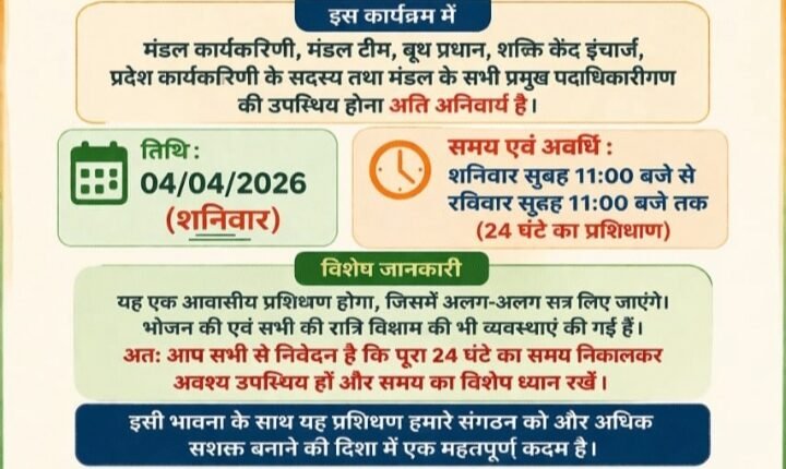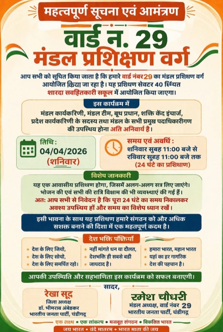 दैनिक खबरनामा चंडीगढ़, 3 अप्रैल 2026 भारतीय जनता पार्टी, चंडीगढ़ के वार्ड नंबर 29 में मंडल स्तर का 24 घंटे का विशेष प्रशिक्षण वर्ग 4 अप्रैल (शनिवार) से आयोजित किया जा रहा है। यह प्रशिक्षण सेक्टर 40 स्थित शारदा सर्वहितकारी स्कूल में होगा, जो शनिवार सुबह 11:00 बजे से शुरू होकर रविवार सुबह 11:00 बजे तक चलेगा।इस प्रशिक्षण वर्ग में मंडल कार्यकारिणी, मंडल टीम, बूथ प्रधान, शक्ति केंद्र इंचार्ज, प्रदेश कार्यकारिणी के सदस्य तथा मंडल के सभी प्रमुख पदाधिकारीगण की उपस्थिति अनिवार्य रखी गई है। कार्यक्रम को आवासीय स्वरूप दिया गया है, जिसमें प्रतिभागियों के लिए भोजन और रात्रि विश्राम की विशेष व्यवस्थाएं भी की गई हैं।आयोजकों के अनुसार, प्रशिक्षण के दौरान विभिन्न सत्रों के माध्यम से संगठनात्मक कौशल, कार्यप्रणाली और जिम्मेदारियों को लेकर विस्तृत मार्गदर्शन दिया जाएगा। इस पहल को संगठन को और अधिक मजबूत और प्रभावी बनाने की दिशा में एक महत्वपूर्ण कदम माना जा रहा है।कार्यक्रम को लेकर कार्यकर्ताओं से अपील की गई है कि वे पूरे 24 घंटे का समय निकालकर प्रशिक्षण में अनिवार्य रूप से भाग लें और समय का विशेष ध्यान रखें। आयोजन के साथ देशभक्ति की भावना को भी प्रोत्साहित किया जाएगा, जिसमें “देश के लिए जियो, देश के लिए सोचो जैसे संदेशों के माध्यम से कार्यकर्ताओं को प्रेरित किया जाएगा।जिला अध्यक्ष रेखा सूद और मंडल अध्यक्ष रमेश चौधरी ने कहा कि इस प्रकार के प्रशिक्षण वर्ग संगठन को मजबूत करने और कार्यकर्ताओं को एकजुट करने में अहम भूमिका निभाते हैं।कार्यक्रम का उद्देश्य “एक लक्ष्य, एक संकल्प, मजबूत संगठन, विकसित भारत” के संकल्प को आगे बढ़ाना है। आयोजन को सफल बनाने के लिए सभी पदाधिकारियों और कार्यकर्ताओं की सक्रिय सहभागिता अपेक्षित है।